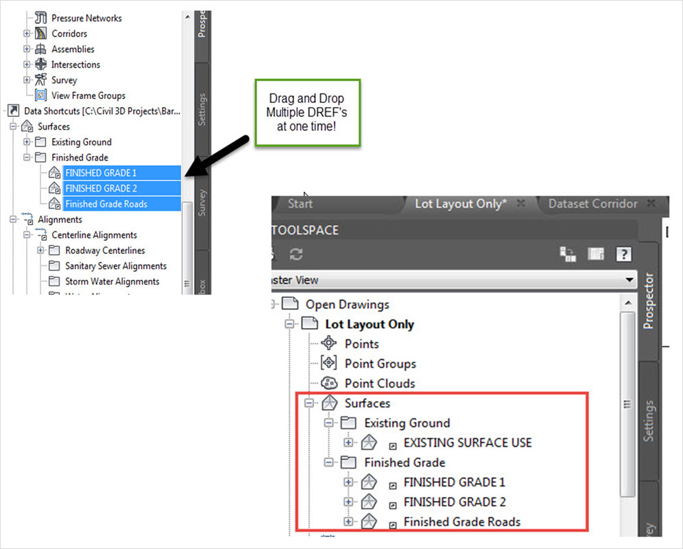 Acceso directo a datos de obra lineal (mejorado) Cree accesos directos a datos de obra lineal para que otros dibujos puedan referenciarlos. Si se crean accesos directos a datos para una obra lineal, también se crean accesos directos para las alineaciones y los perfiles que componen las líneas base de la obra lineal. Guarde la geometría de una superficie de referencia en el dibujo que contiene la referencia de acceso directo a datos y cree varias referencias de acceso directo a datos de forma simultánea. |