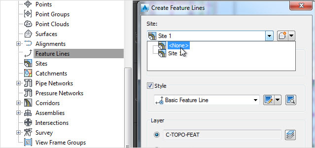 Opción "Ningún emplazamiento" para líneas características Las líneas características que se crean fuera de un emplazamiento no interactúan entre sí; por lo tanto, no hace falta especificarles ninguna prioridad de estilo como se hace con las que existen en el mismo emplazamiento. Estas líneas "sin emplazamiento" no interactúan con los otros objetos con que se intersecan, por ejemplo alineaciones, parcelas o representaciones topográficas. |